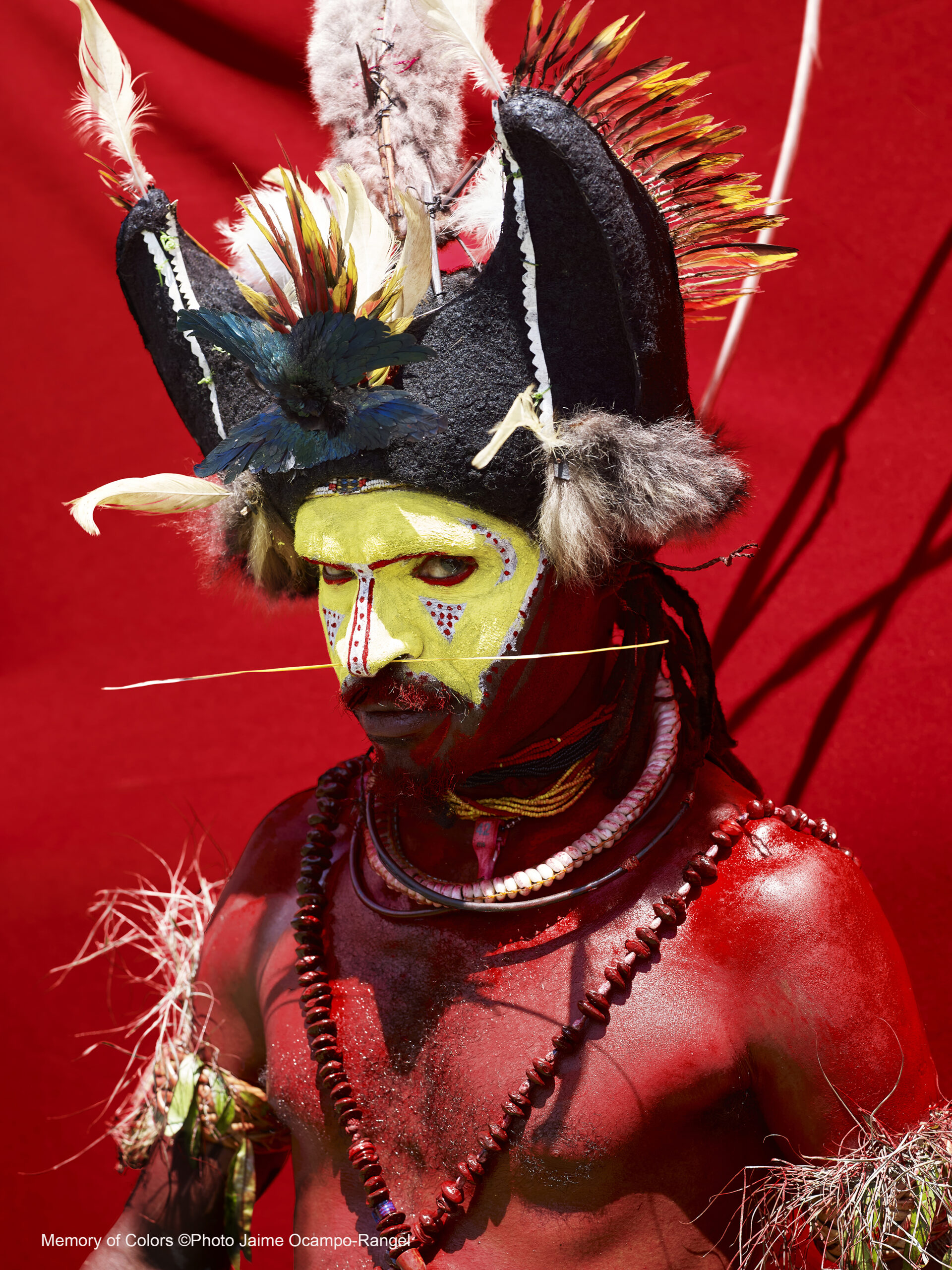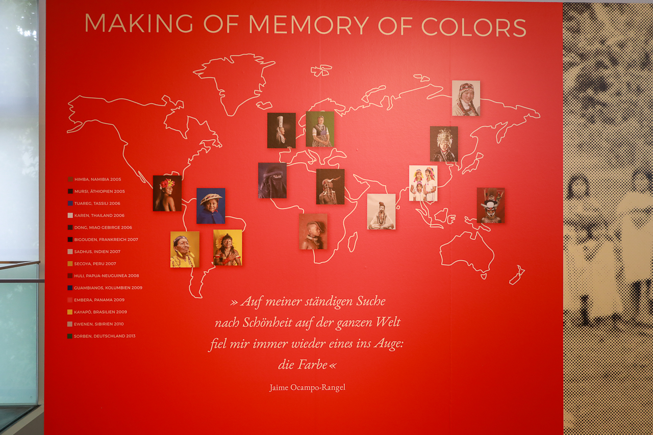 Die Ausstellung zeigt Fotografien von Menschen verschiedener Ethnien und Lebensweisen sowie von fast allen Kontinenten – darunter die Dong aus dem Süden Chinas, Huli aus Papua-Neuguinea und europäische Sorben. Bei seiner Arbeit ist ihm aufgefallen, welche große Bedeutung und Ausdrucksstärke – je nach geographischem Kontext und Lebensweise – bestimmte Farben besitzen; etwa Ocker bei den Himba in Namibia oder Gelb bei den Secoya im Amazonas. Jaime Ocampo-Rangel fotografiert deshalb einzelne Personen oder Gruppen jeweils vor einem monochromen, farbigen Hintergrund. Die Farbe wählt er assoziativ, etwa nach Kleidung, Umgebung oder kultureller Bedeutung. Nebeneinander gestellt ergeben die verschiedenen Farben der Fotografien einen vervielfachten Regenbogen, der für den Künstler die Mannigfaltigkeit der Menschen und Völker symbolisiert, ihre Schönheit und Gemeinsamkeiten. „Memory of Colors“ versucht, diese immaterielle, kulturelle Vielfalt fotografisch zu bewahren.